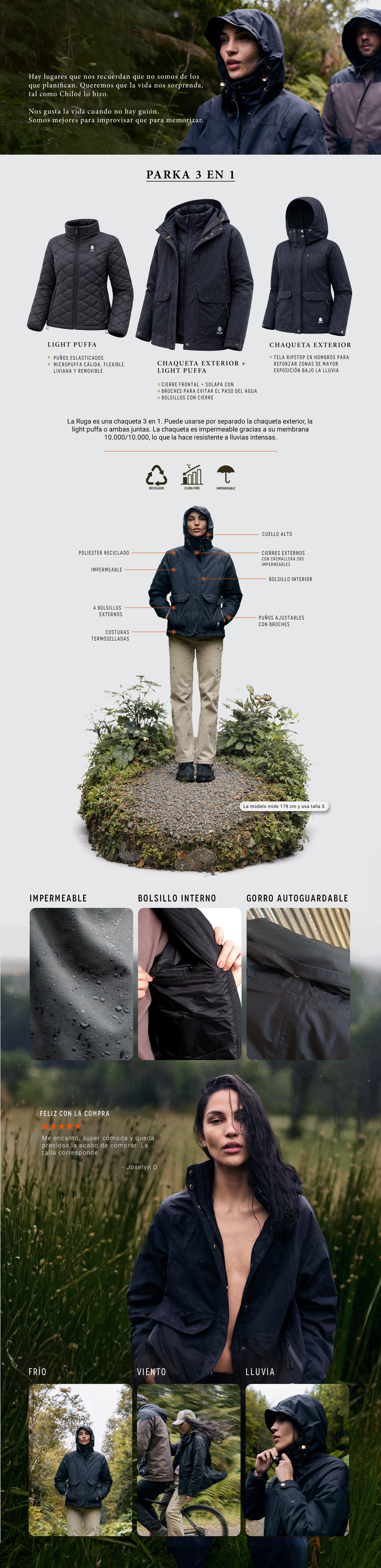 Porque te queremos acompañar en todas tus aventuras, creamos una parka 3 en 1 para que lo puedas utilizar de tres formas diferentes según tus necesidades. Incluye una light puffa con propiedades térmicas para abrigarte, una capa exterior impermeable para días de lluvia, y puedes usar ambas juntas para una mayor calidez y protección.